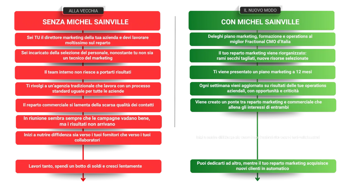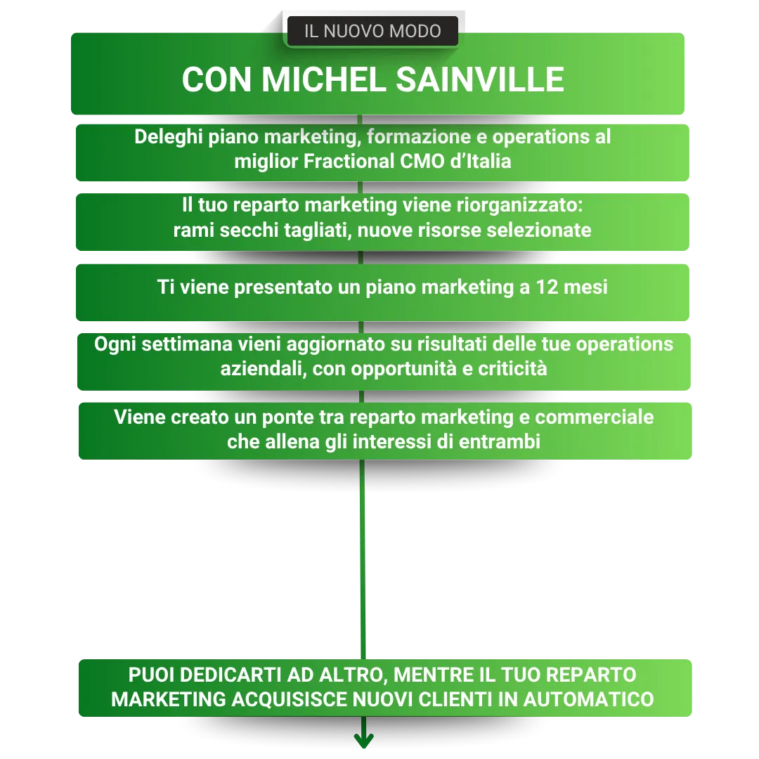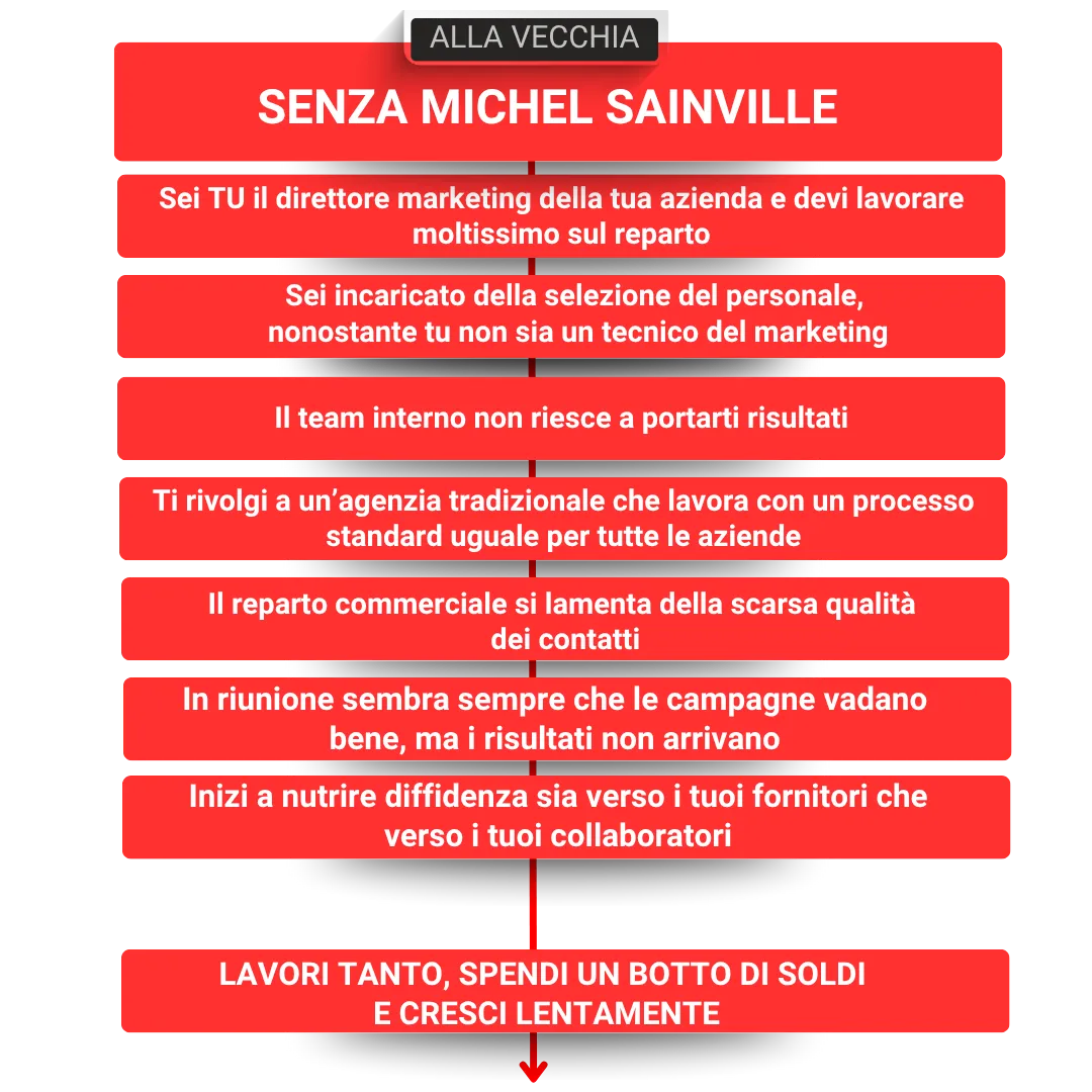 Un'agenzia tradizionale esegue servizi specifici per te (pubblicità, sito web, ecc.) ma non costruisce la tua capacità interna. Michel invece lavora come parte del tuo team, formando le tue risorse e creando procedure che rimarranno nella tua azienda.